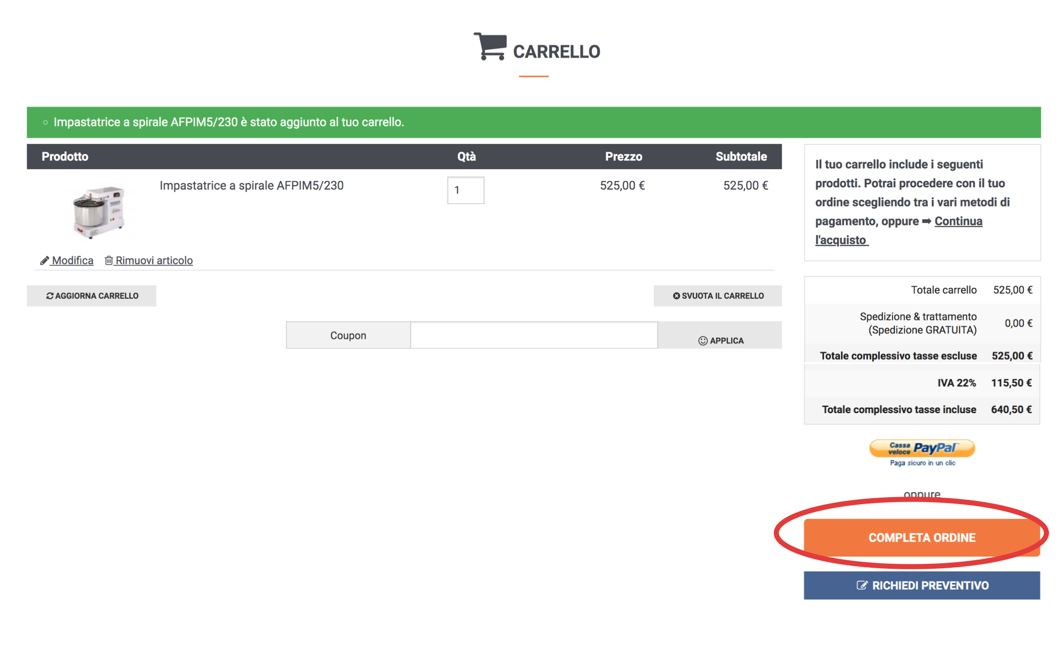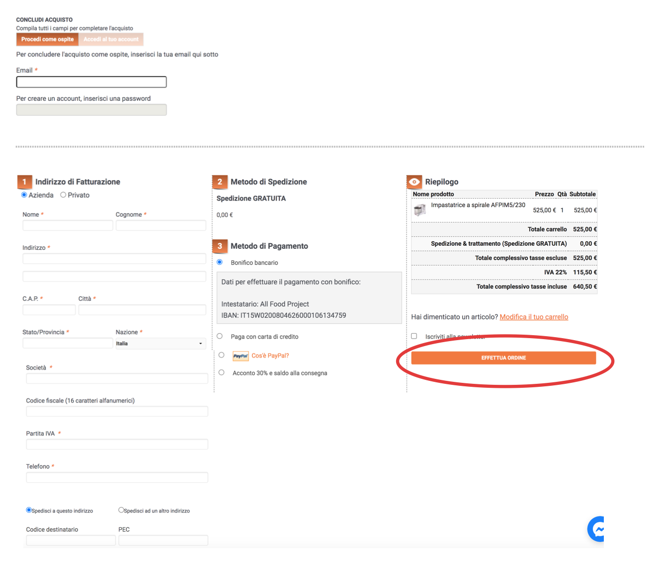 Inserisci i tuoi dati di fatturazione per completare l'acquisto: scegli il metodo di pagamento, inserisci eventuali note e clicca su EFFETTUA ORDINE.